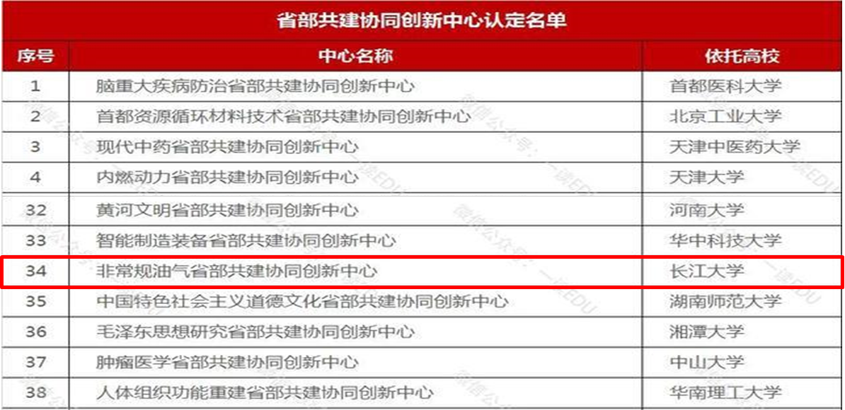 长江大学“非常规油气省部共建协同创新中心”,属于“2011协同创新计划”的一部分,是经湖北省教育厅、财政厅在2012年批准建设的省级协同创新中心,由长江大学牵头、协同武汉大学、中国地质大学(武汉)、中石化江汉油田分公司等多家单位,围绕非常规油气共同建设。经过5年的建设,于2017年12月15日被湖北省教育厅验收评估为“优秀”等级,2018年12月4日被教育部认定为省部共建协同创新中心(全国仅59个,湖北省省属高校唯一、全国唯一非常规油气省部共建协同创新中心),目前建设成具有一定影响力和行业产业特色鲜明的协同创新中心。