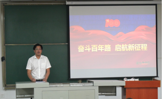 杨全辉结合建党一百周年相关时事政治内容,分别从丰功伟绩,恢弘史诗;精神血脉,代代相传;以史为鉴,开创未来等三个方面进行授课。