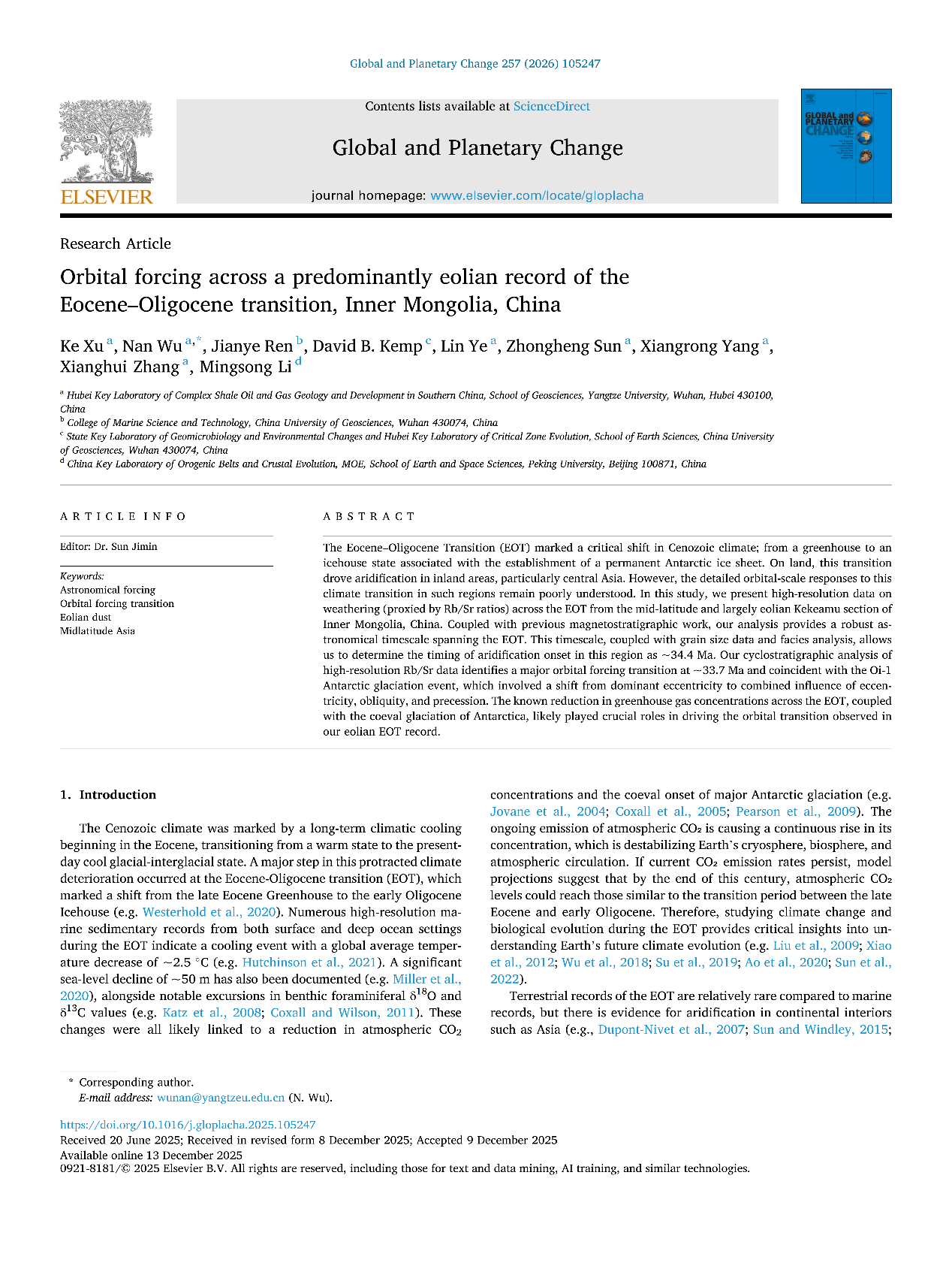 (通讯员 杨向荣)地球科学学院石油系教师许可在中科院一区TOP期刊《Global and Planetary Change》上发表题为“Orbital forcing across a predominantly eolian record of the Eocene–Oligocene transition, Inner Mongolia, China”的论文,长江大学南方复杂页岩油气地质与开发湖北省重点实验室为论文第一署名单位,许可博士为第一作者,吴楠教授为唯一通讯作者,研究获得国家自然科学基金和新型油气勘探开发国家科技重大专项联合资助。