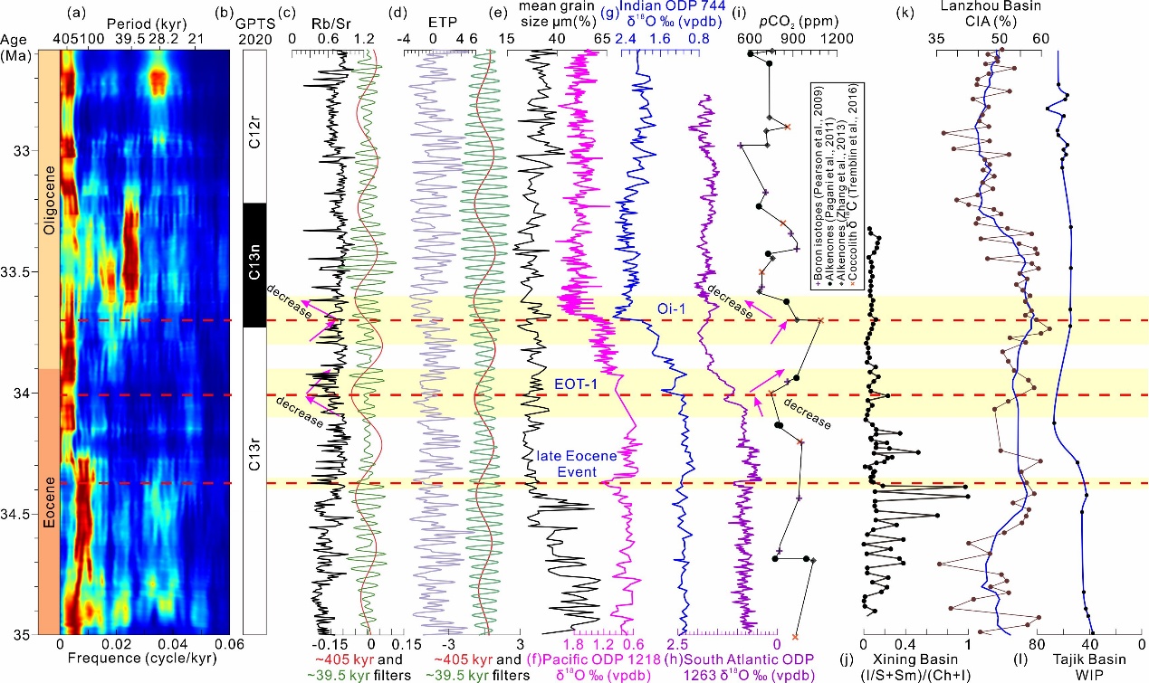 始新世–渐新世过渡期(EOT)是新生代气候演变的关键转折点,标志着地球从“温室”状态进入“冰室”状态,南极永久冰盖开始形成。在这一时期,内陆亚洲地区普遍出现干旱化,但其干旱化的具体时间、过程及轨道尺度的响应模式,长期以来缺乏高分辨率记录的约束。为厘清上述问题,本研究对我国内蒙古克克阿木剖面风成沉积地层进行了高分辨率取样(5 cm),获取了约27 m长的Rb/Sr和粒度数据。通过将这些新指标与已发表的磁性地层学成果整合,研究团队首次建立了该剖面高精度的绝对天文年代标尺。研究表明,该地区在约34.4 Ma发生了从河漫滩环境(34.4 Ma以前)向风成沉积(34.4 Ma至今)的环境转变,这标志着本地区干旱化的起始时间。这一转变很可能由全球变冷、大气CO₂浓度下降及区域构造活动共同驱动。更重要的是,在约33.7 Ma发生了显著的轨道周期转变:从以偏心率主导转变为偏心率、斜率和岁差的共同影响,这一转变与南极Oi1冰盖事件在时间上高度吻合。研究指出,EOT期间全球温室气体浓度下降和南极冰盖增长的协同作用,是驱动亚洲内陆气候系统轨道响应模式发生转变的关键机制。该研究不仅为亚洲内陆干旱化进程提供了重要的年代参考,也揭示了轨道作用力在重大气候转型期的调控作用。这一成果对理解地球系统在重大气候临界期的行为提供了关键证据。研究同时指出,未来需结合气候模拟与动态古地理重建,进一步揭示EOT时期轨道–冰盖–构造–大气之间的耦合机制。