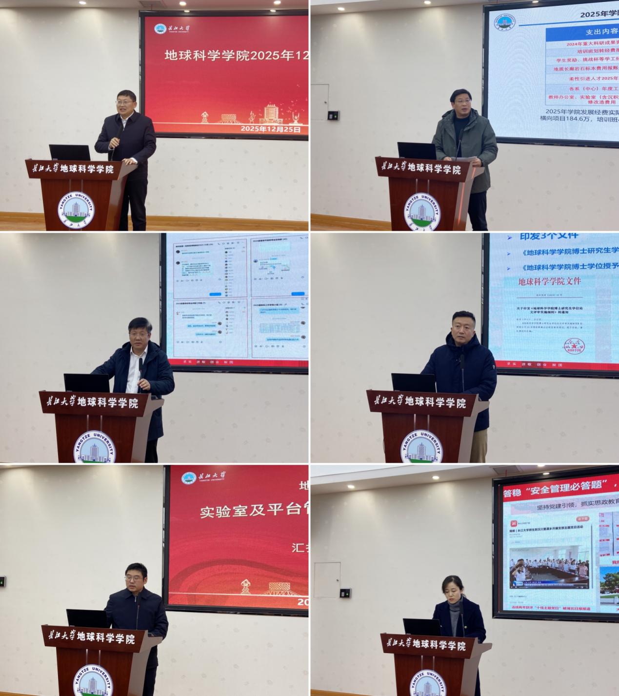 (通讯员 韩静)2025年12月25日,地球科学学院在石油科技大楼C301会议室召开全院教职工大会暨年终总结会,总结本年度学院重点工作完成情况,进行各系 (中心) 年终述职,并开展政治理论学习。会议分三个阶段进行,会议由院长朱光有主持。