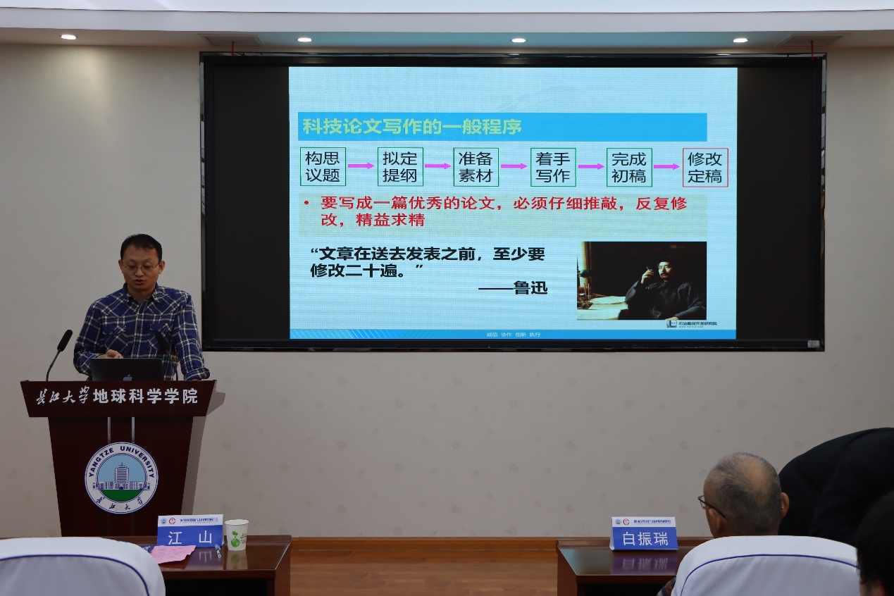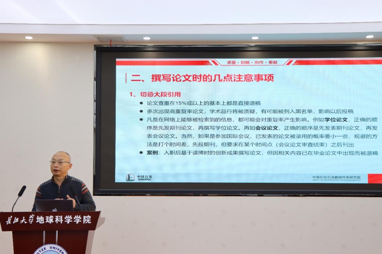 (通讯员 卢志远 胡静怡 范秀武/摄)2026年1月10日,特别邀请石油地质领域知名期刊《石油与天然气地质》和《Energy geosciences》执行主编白振瑞教授、副主编张亚雄教授,在石油科技大楼C301会议室为武汉校区师生作题为《高水平科技论文写作与期刊投稿技巧》的专题讲座。会议由学院副院长江山教授主持,胡明毅教授、卢志远特任教授等100余位师生参加了此次报告会。