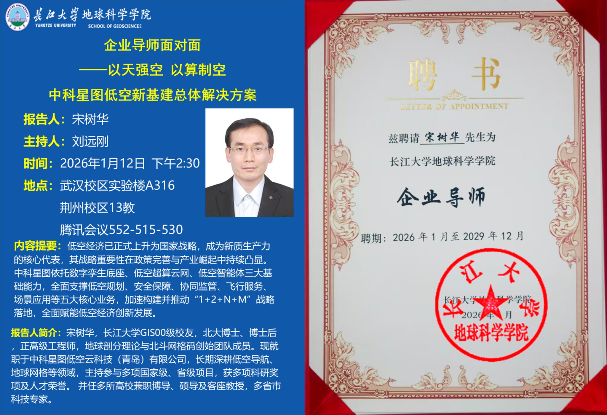 (通讯员:井然)2026年1月12日下午,地球科学学院“企业导师面对面”活动在武汉校区实验楼A316及荆州校区13教D425线上线下同步举行。本次讲座特别邀请了地信00级校友、中科星图低空云科技(青岛)有限公司技术总师宋树华博士作为主讲嘉宾,为我院师生带来了题为“以天强空 以算制空——中科星图低空新基建总体解决方案”的专题报告。会议由地信系主任刘远刚主持,地科学院100余名师生通过线上线下结合的方式参与了此次交流。