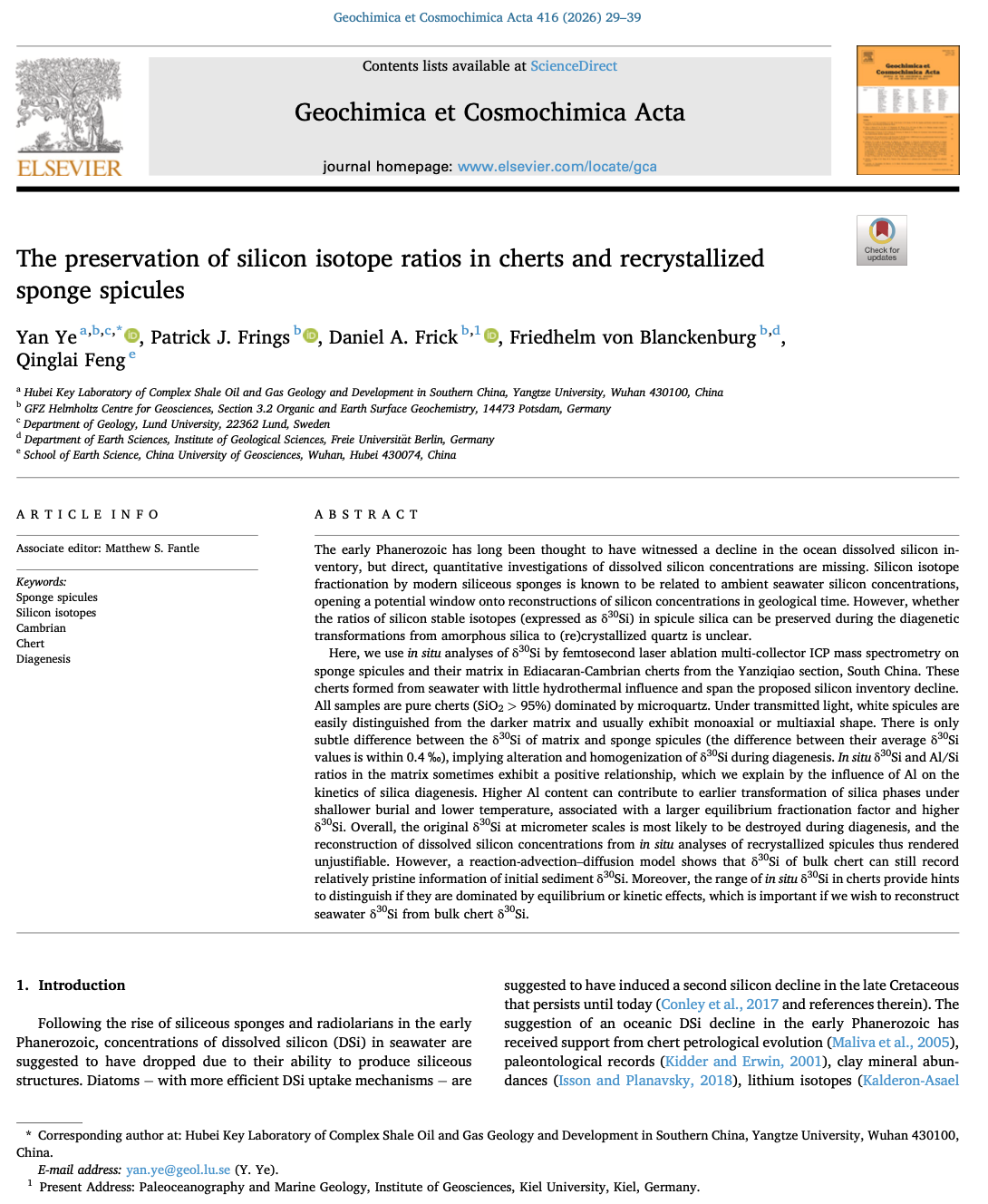 (通讯员 陈粲)地球科学学院特任副教授叶炎以第一作者身份,近期在地球科学领域国际权威期刊《Geochimica et Cosmochimica Acta》上发表了题为“The preservation of silicon isotope ratios in cherts and recrystallized sponge spicules”的研究论文。长江大学为论文第一署名单位。