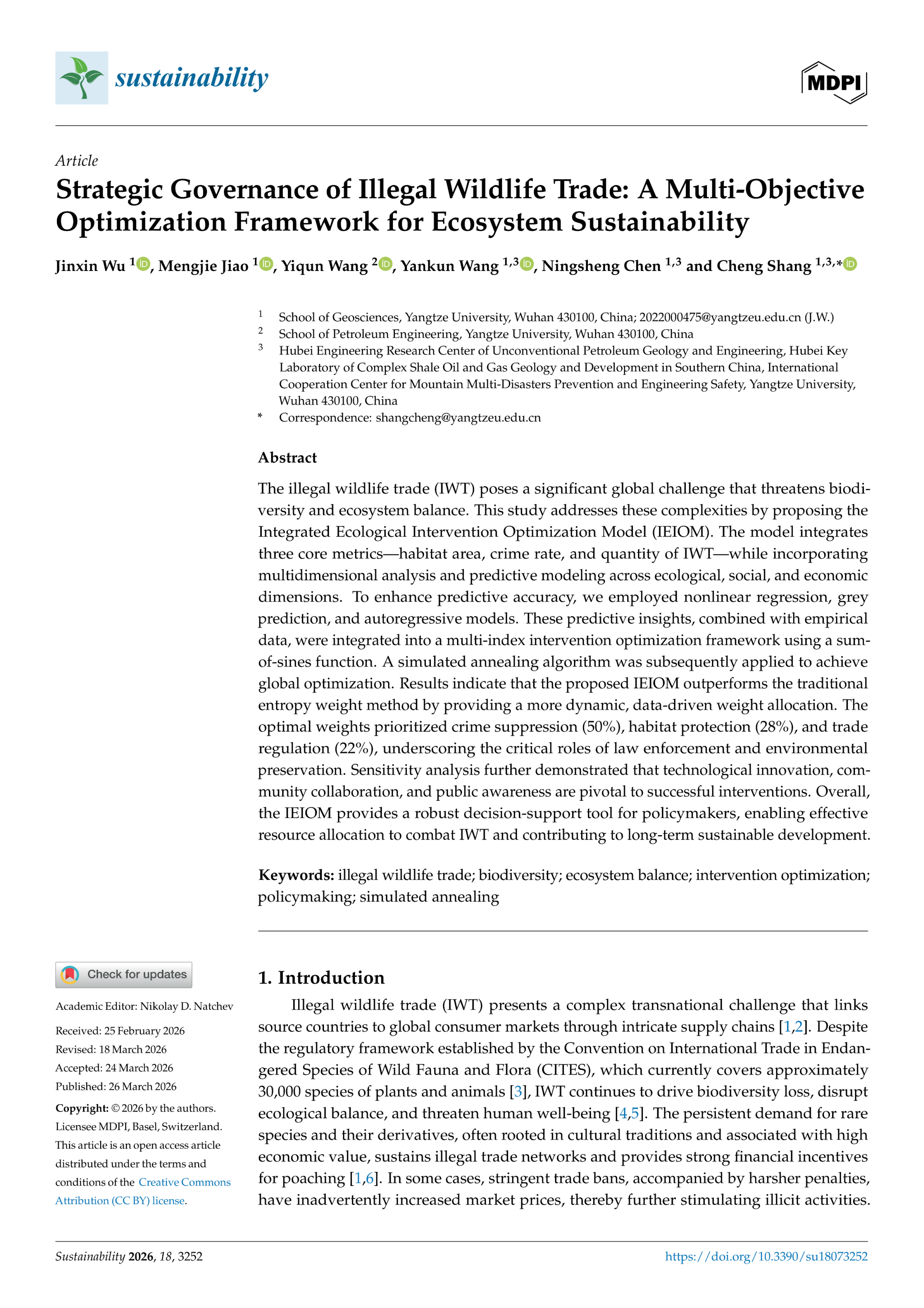 (通讯员 尚成)近日,地球科学学院本科生吴金鑫及其团队在资源与环境类SCI期刊《Sustainability》发表题为“Strategic Governance of Illegal Wildlife Trade: A Multi-Objective Optimization Approach Integrating Ecological Intervention”的研究论文。长江大学地球科学学院为论文第一署名单位,吴金鑫为论文第一作者,尚成老师为通讯作者,论文于尚成/陈宁生老师共同指导下完成。