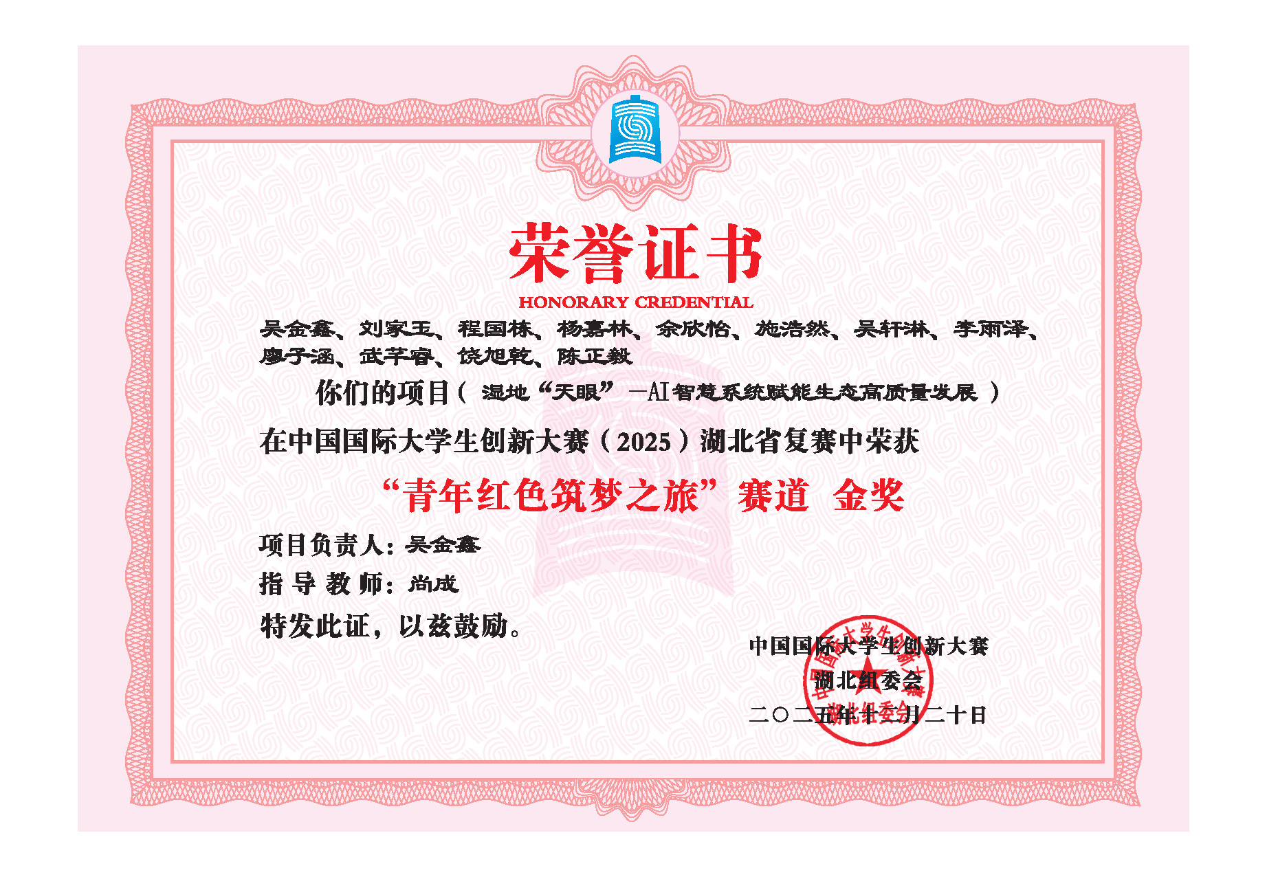 图2 中国国际大学生创新大赛(2025)湖北省金奖荣誉证书
