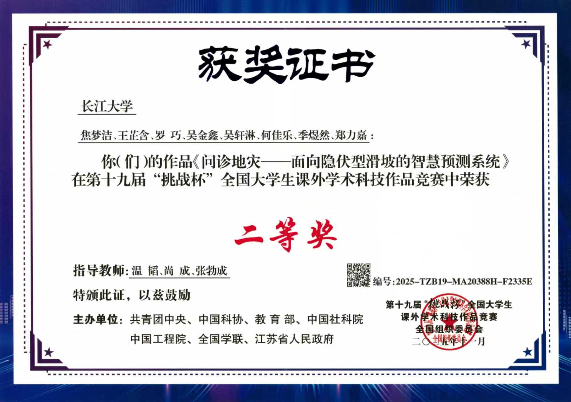 图3 第十九届“挑战杯”全国大学生课外学术科技作品竞赛全国二等奖获奖证书