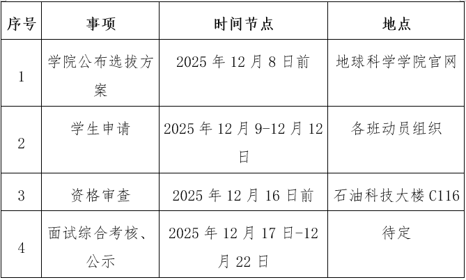 上述材料于12月12日前完成并提交,其中,申请表以及获奖证书等有关材料的原件和复印件需提交纸质版至地球科学学院教学办公室(石油科技大楼C116室)。