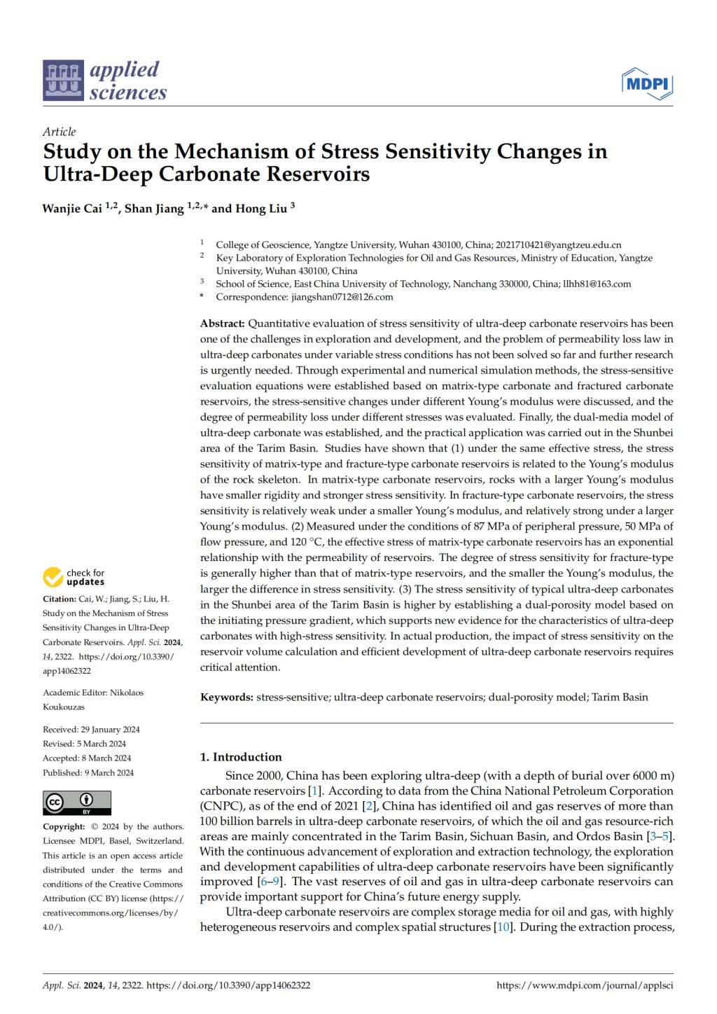 地科学院硕士生蔡万杰在《Applied sciences》发表题为“Study on the Mechanism of Stress Sensitivity Changes inUltra-Deep Carbonate Reservoirs”的研究论文。长江大学地球科学学院为论文第一署名单位,硕士生蔡万杰为论文第一作者,教师江山为通讯作者。