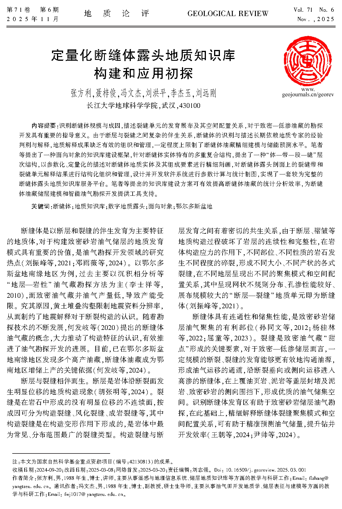 地球科学学院油气储层智能研究中心张方利博士在期刊《地质论评》上发表题为“定量化断缝体露头地质知识库构建和应用初探”的研究论文(图1)。长江大学地球科学学院为论文唯一署名单位,张方利为第一作者,冯文杰副教授为通讯作者。