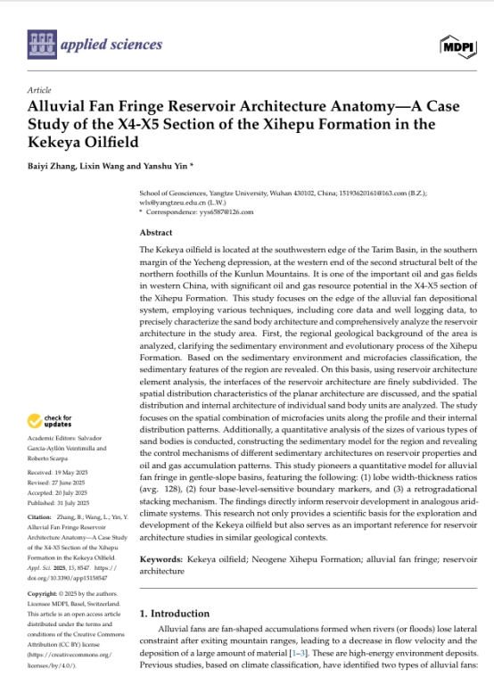 地球科学学院硕士生张佰义在SCI收录期刊《Applied Sciences》上发表题为“Alluvial Fan Fringe Reservoir Architecture Anatomy — A Case Study of the X4-X5 Section of the Xihepu Formation in the Kekeya Oilfield”的研究论文。长江大学地球科学学院为论文第一署名单位,张佰义为论文第一作者,尹艳树教授为通讯作者。