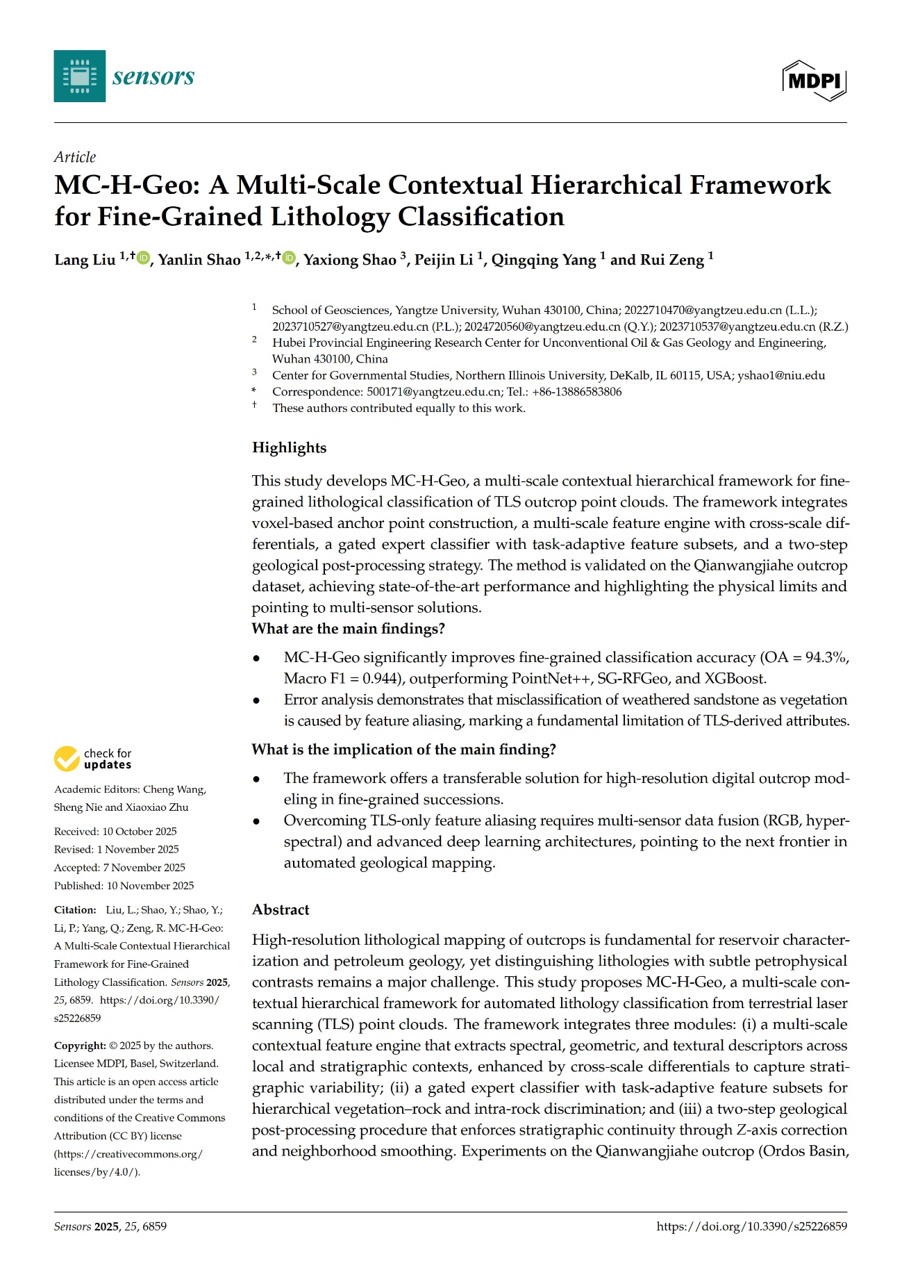 地科学院邵燕林副教授团队长期从事数字露头、储层三维表征等方面的研究,团队硕士生刘浪在遥感领域期刊《Sensors》上发表题为“MC-H-Geo: A Multi-Scale Contextual Hierarchical Framework for Fine-Grained Lithology Classification”的研究论文。长江大学地球科学学院为论文第一署名单位,硕士生刘浪为论文第一作者,邵燕林副教授为该文通讯作者。