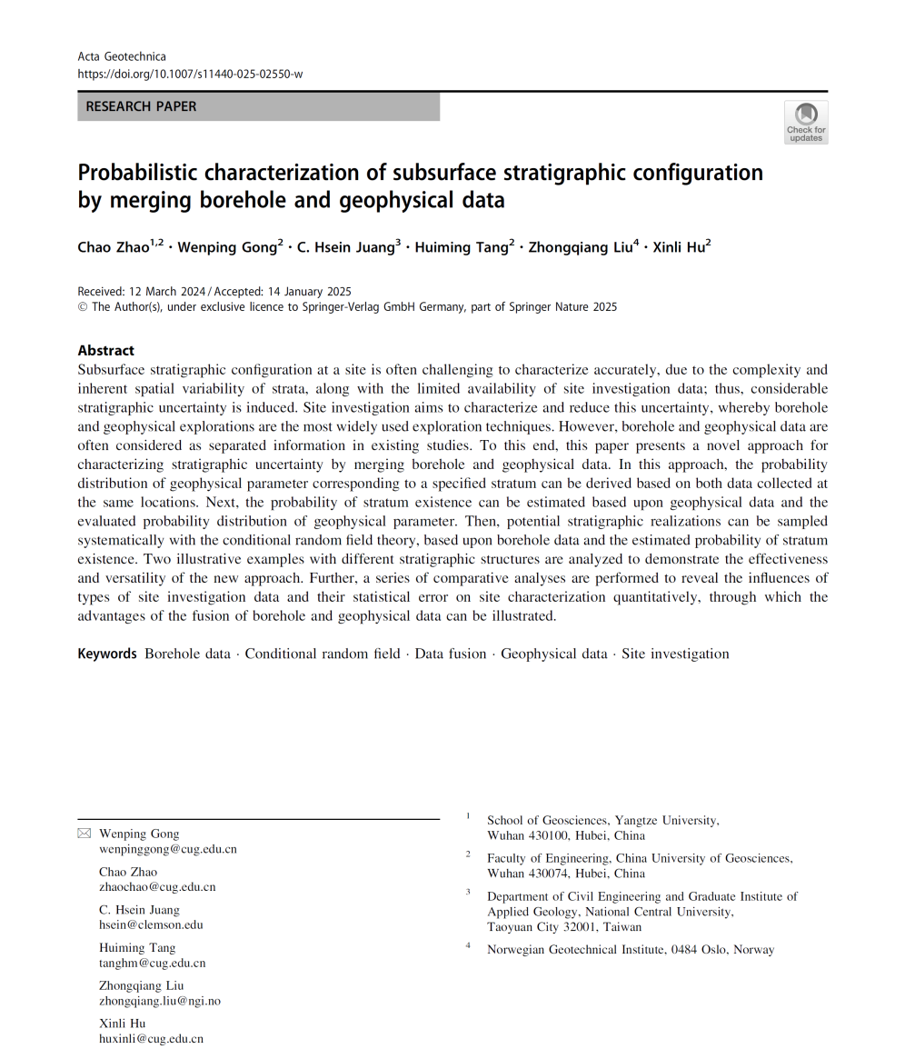 地球科学学院特任教授赵超在《Acta Geotechnica》发表题为“Probabilistic characterization of subsurface stratigraphic configuration by merging borehole and geophysical data”的研究论文(图1)。赵超为第一作者,长江大学为第一完成单位。