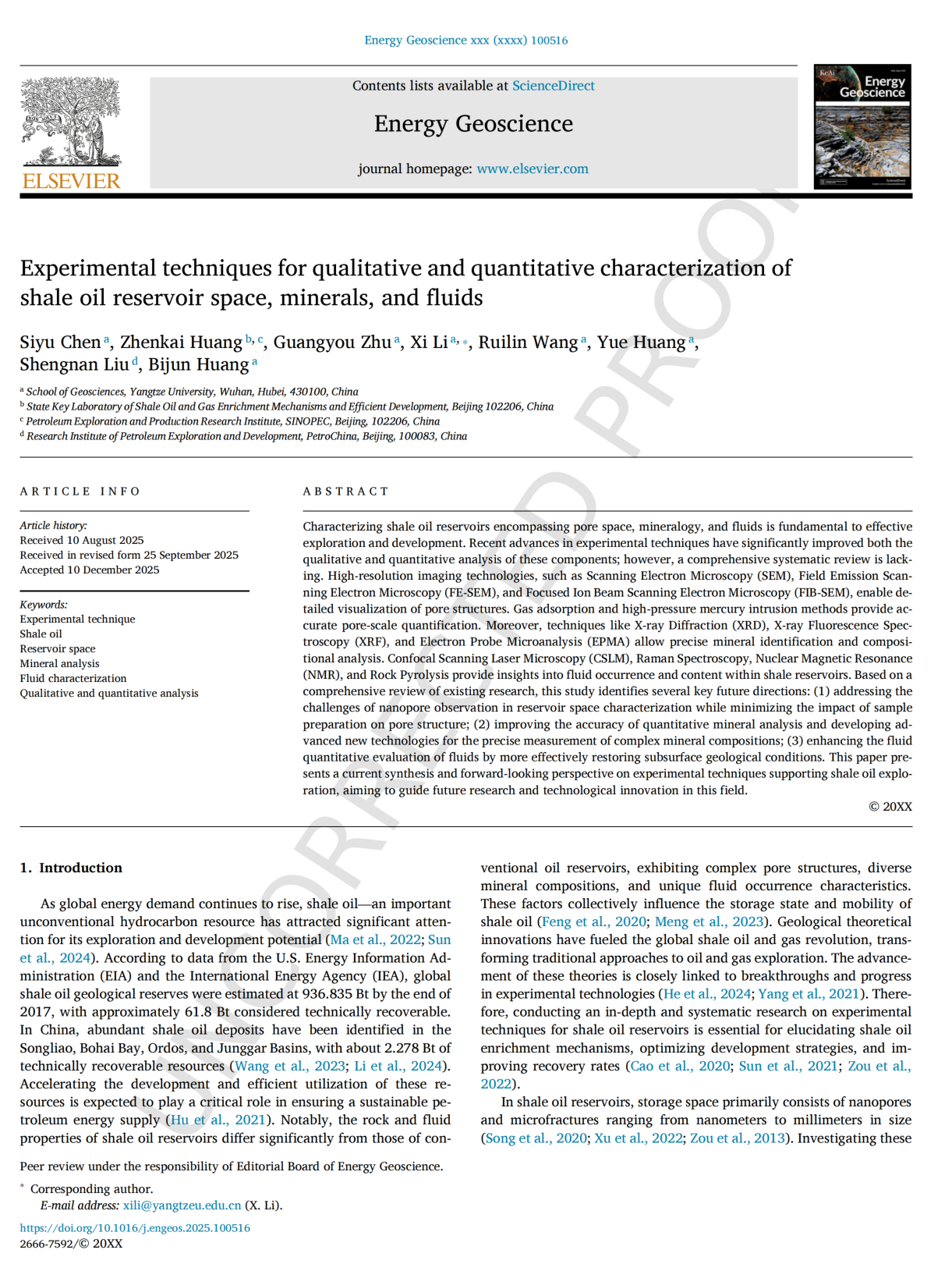 近日,地科学院2025级地质资源与地质工程专业硕士研究生陈思钰以第一作者身份在《Energy Geoscience》上发表了题为“Experimental techniques for qualitative and quantitative characterization of shale oil reservoir space, minerals, and fluids”的研究论文。长江大学地球科学学院为第一完成单位和通讯作者单位。