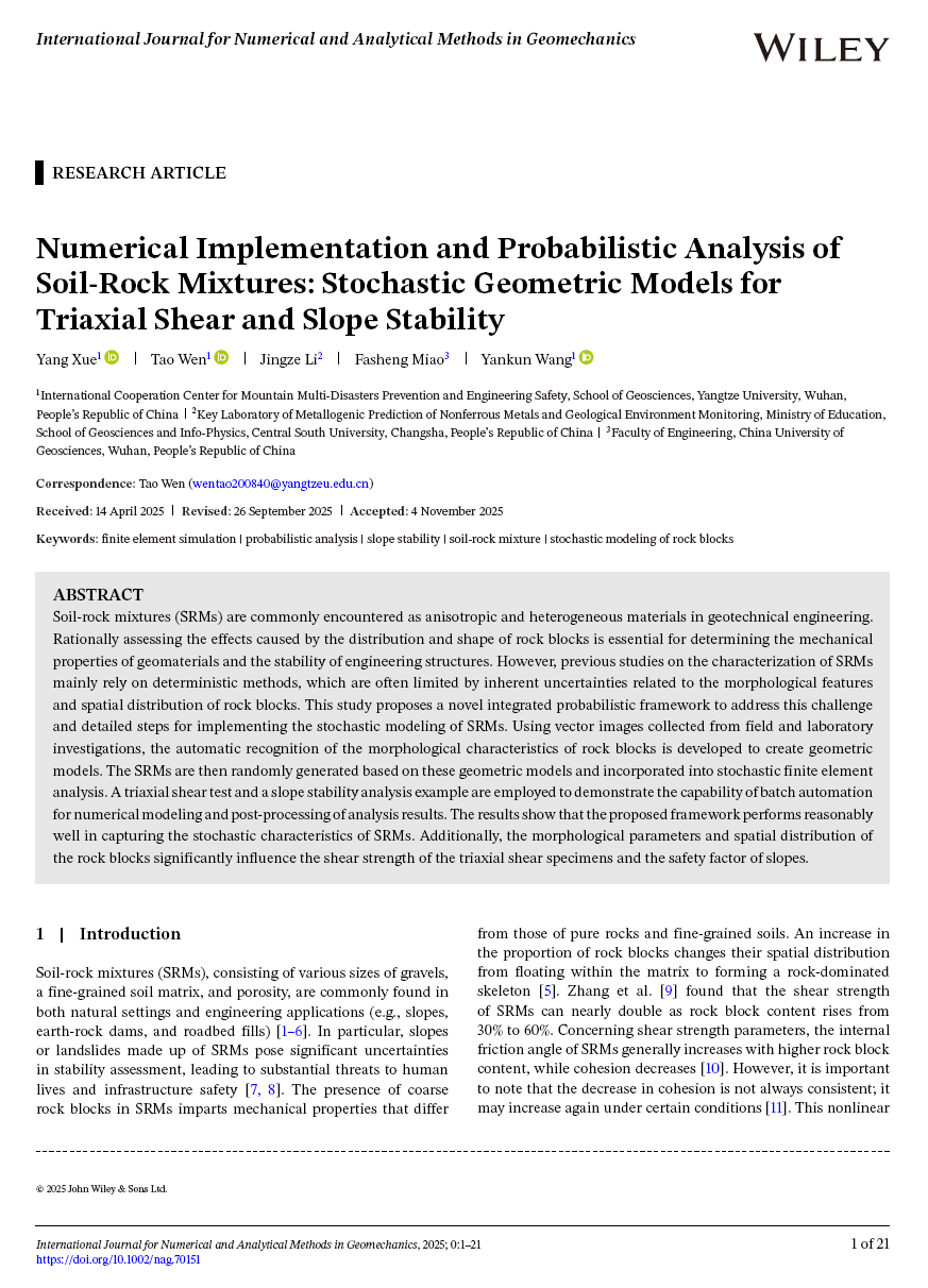 地球科学学院地质系、工程地质研究中心团队成员薛阳副教授在老牌期刊《International Journal for Numerical and Analytical Methods in Geomechanics》(位列JCR分区一区,中科院大类二区)上发表题为“Numerical Implementation and Probabilistic Analysis of Soil-Rock Mixtures: Stochastic Geometric Models for Triaxial Shear and Slope Stability”的论文(图1),薛阳副教授为第一作者,温韬教授为通讯作者,长江大学为第一完成单位。