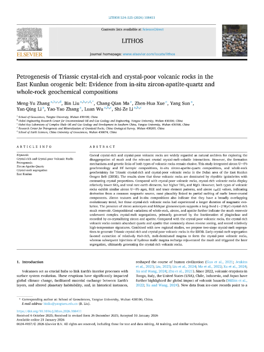 地科学院2023级地质学硕士研究生张萌雨以第一作者身份在中科院二区TOP期刊《Lithos》上发表了题为“Petrogenesis of Triassic crystal-rich and crystal-poor volcanic rocks in the East Kunlun orogenic belt: Evidence from in-situ zircon-apatite-quartz and whole-rock geochemical compositions”的研究论文(图1)。长江大学地球科学学院为论文第一署名单位、通讯作者单位,硕士生张萌雨为论文第一作者,其导师刘彬教授为论文通讯作者。