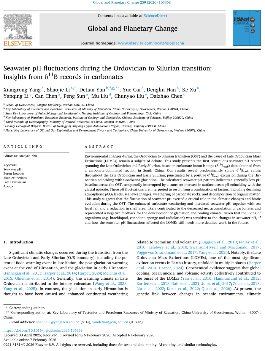 我校地球科学学院杨向荣副教授在中科院一区期刊《Global and Planetary Change》发表题为“Seawater pH fluctuations during the Ordovician to Silurian transition:Insights from δ11B records in carbonates”的研究论文,地球科学学院李劭杰特任教授为第一通讯作者,第一署名单位为长江大学(图1)。论文介绍了奥陶纪-志留纪这一重要地质历史转折期内的古气候条件转变过程,及其影响下的表层海水酸碱度(pH)值变化和生物演化过程。
