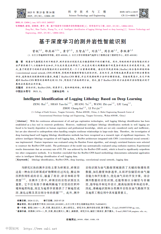 地球科学学院硕士生曾锐在邵燕林副教授的指导下,在EI期刊《科学技术与工程》发表题为“基于深度学习的测井岩性智能识别”的研究论文,长江大学地球科学学院与非常规油气地质与工程湖北省工程研究中心为论文第一署名单位,硕士生曾锐为论文第一作者,其导师邵燕林副教授为该文通讯作者。