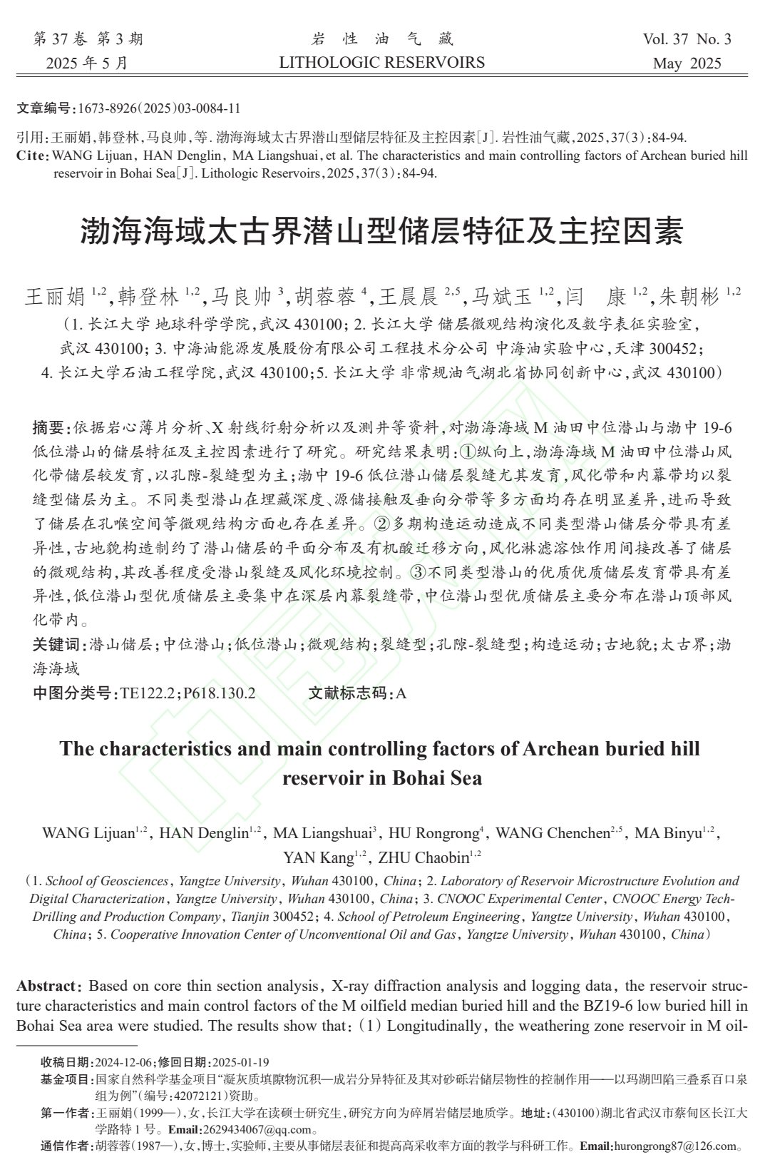 地球科学学院2023级地质学专业硕士生王丽娟在《岩性油气藏》上发表题为“渤海海域太古界潜山型储层特征及主控因素”的研究论文。长江大学地球科学学院为论文第一署名单位,硕士生王丽娟为论文第一作者。本研究成果依托长江大学储层微观结构演化及数字表征实验室完成,并得到国家自然科学基金项目(42072121)的资助。相关研究成果发表于该期刊第3期。