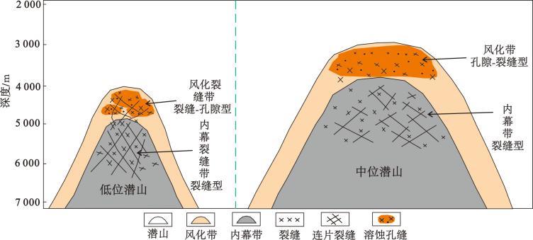 图1渤海海域渤中凹陷不同类型潜山纵向分带及古地貌特征模式图