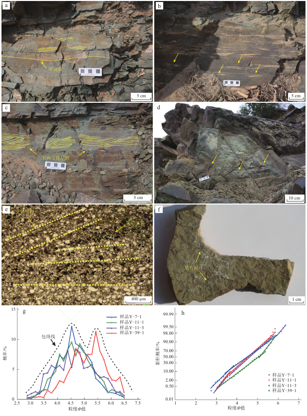 等深流与重力流交互作用沉积的相关研究,目前仍存在研究实例匮乏、研究程度偏低、识别标志不够完善及形成机制尚不明确等薄弱环节。本研究通过野外实测、薄片鉴定与粒度分析等技术手段,系统研究了鄂尔多斯西缘奥陶系樱桃沟组等深流与重力流交互作用的沉积特征(图 2)、演化规律及形成过程,建立了相应的沉积模式(图 3)。