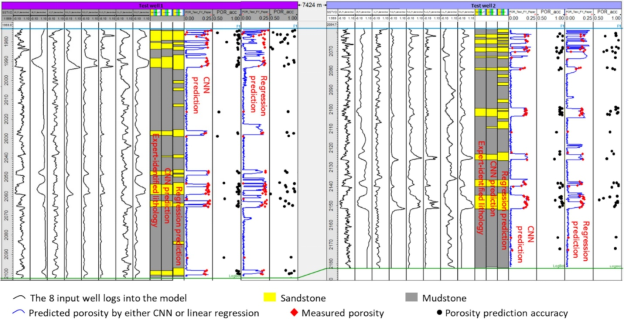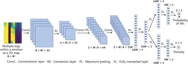 岩性识别和孔隙度预测是油气勘探开发及储层评价中的关键环节,对油气储量评估、储层建模以及地下资源开发具有重要意义。传统方法通常依赖测井曲线交会图、经验公式或统计学习方法,但这些方法往往仅利用单个深度点的测井信息,难以充分挖掘测井曲线在垂向邻域中的地质信息,因此在复杂储层条件下预测精度仍然有限。针对这一问题,该研究提出了一种基于深度滑动窗口和卷积神经网络的联合预测方法。该方法通过构建滑动窗口提取目标深度上下范围内的多种测井曲线信息,并将其转换为二维数据结构作为输入,利用卷积神经网络自动提取特征并预测窗口中心位置的岩性类型与孔隙度。当滑动窗口沿井筒垂向移动时,模型即可快速完成整个井段的连续预测,实现高效、自动化的测井解释。研究团队利用中国东部某油田289口井的测井数据对方法进行了验证,数据包含伽马(GR)、自然电位(SP)、深电阻率(RLLD)、声波时差(AC)、井径(CAL)等8类测井曲线。实验结果表明,当滑动窗口长度为1.125 m时模型表现最佳,其中,岩性识别准确率可达到94.4%,孔隙度预测准确率达到94.9%。研究结果表明,该方法不仅预测精度高,而且计算效率快,可在油气田新井和老井资料解释中快速推广应用,为智能测井解释和油气储层评价提供了一种新的技术思路。该研究得到了长江大学油气资源勘探技术教育部重点实验室开放基金以及中国石油天然气集团公司创新基金等项目的资助。