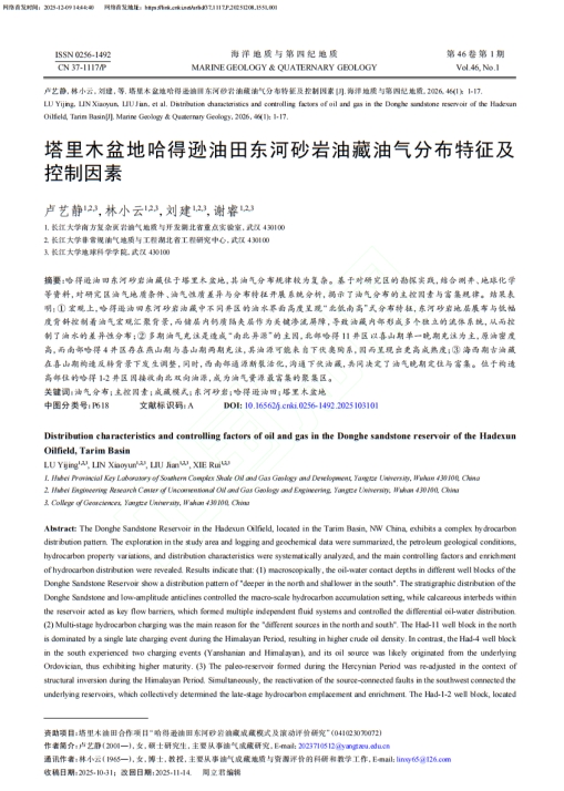 近日,我院2023级地质学硕士研究生卢艺静在中文核心期刊《海洋地质与第四纪地质》上发表题为“塔里木盆地哈得逊油田东河砂岩油藏油气分布特征及控制因素”的论文(共17页)。全部作者均为长江大学地球科学学院师生,研究生卢艺静为第一作者,其导师林小云教授为通讯作者,该研究揭示了塔里木盆地哈得逊油田东河砂岩油藏(下文中简称东河砂岩油藏)的油气运移路径和油气富集规律,为该地区油气勘探提供了新的理论依据。