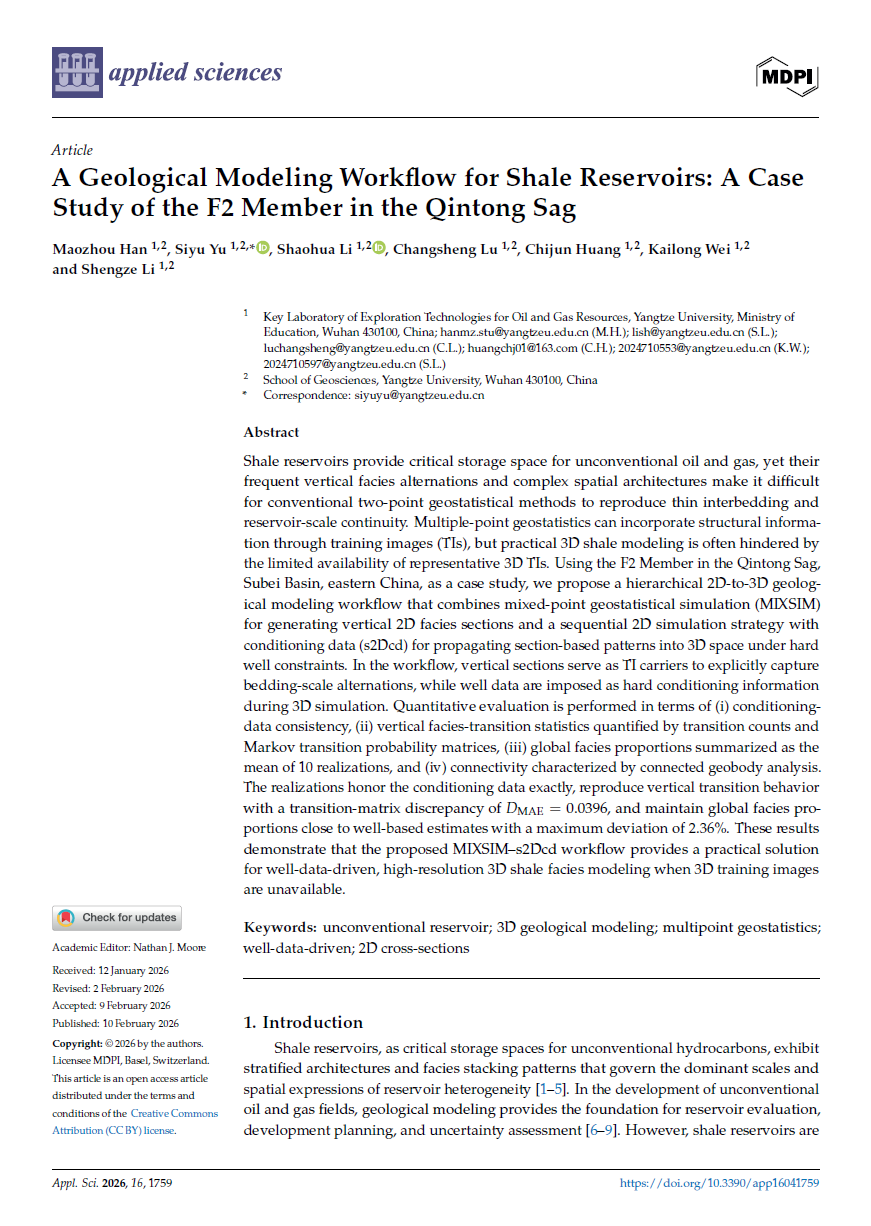 地球科学学院2023级研究生韩茂洲在地球科学与工程应用领域期刊《Applied Sciences》发表题为“A Geological Modeling Workflow for Shale Reservoirs: A Case Study of the F2 Member in the Qintong Sag”的研究论文。长江大学地球科学学院为论文第一署名单位,研究生韩茂洲为论文第一作者,其导师喻思羽为论文通讯作者。