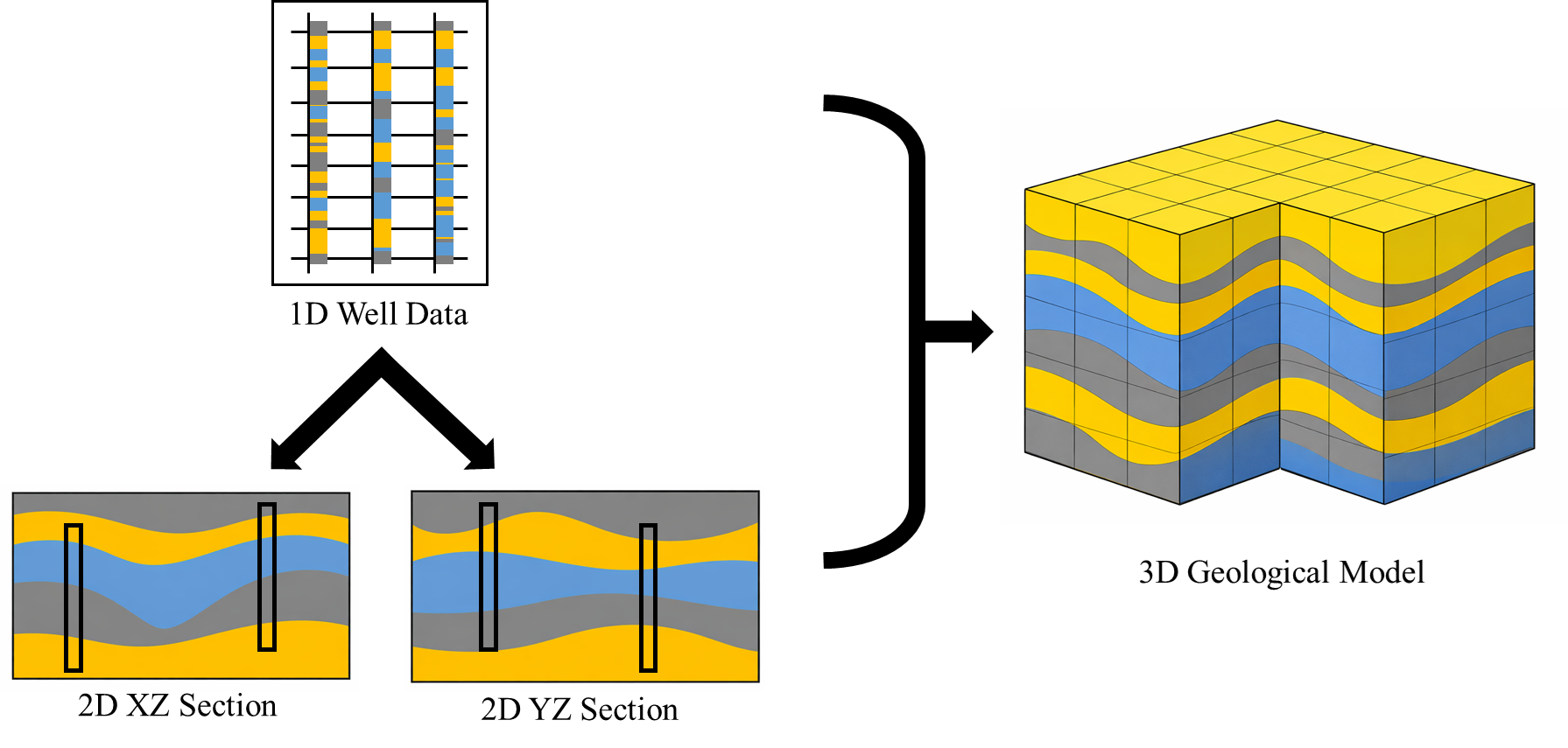 针对上述问题,论文提出了一种面向数据受限条件的分层式页岩储层三维地质建模工作流程。该方法首先在井数据硬约束条件下构建垂向二维岩相剖面,利用混合点地质统计方法(MIXSIM)刻画页岩层理叠置特征和岩相转换规律;随后将二维剖面作为训练图像,通过顺序二维扩展策略(s2Dcd)逐片传播至三维空间,实现三维岩相结构的渐进式构建。在整个建模过程中,井数据始终作为硬约束信息严格保留。