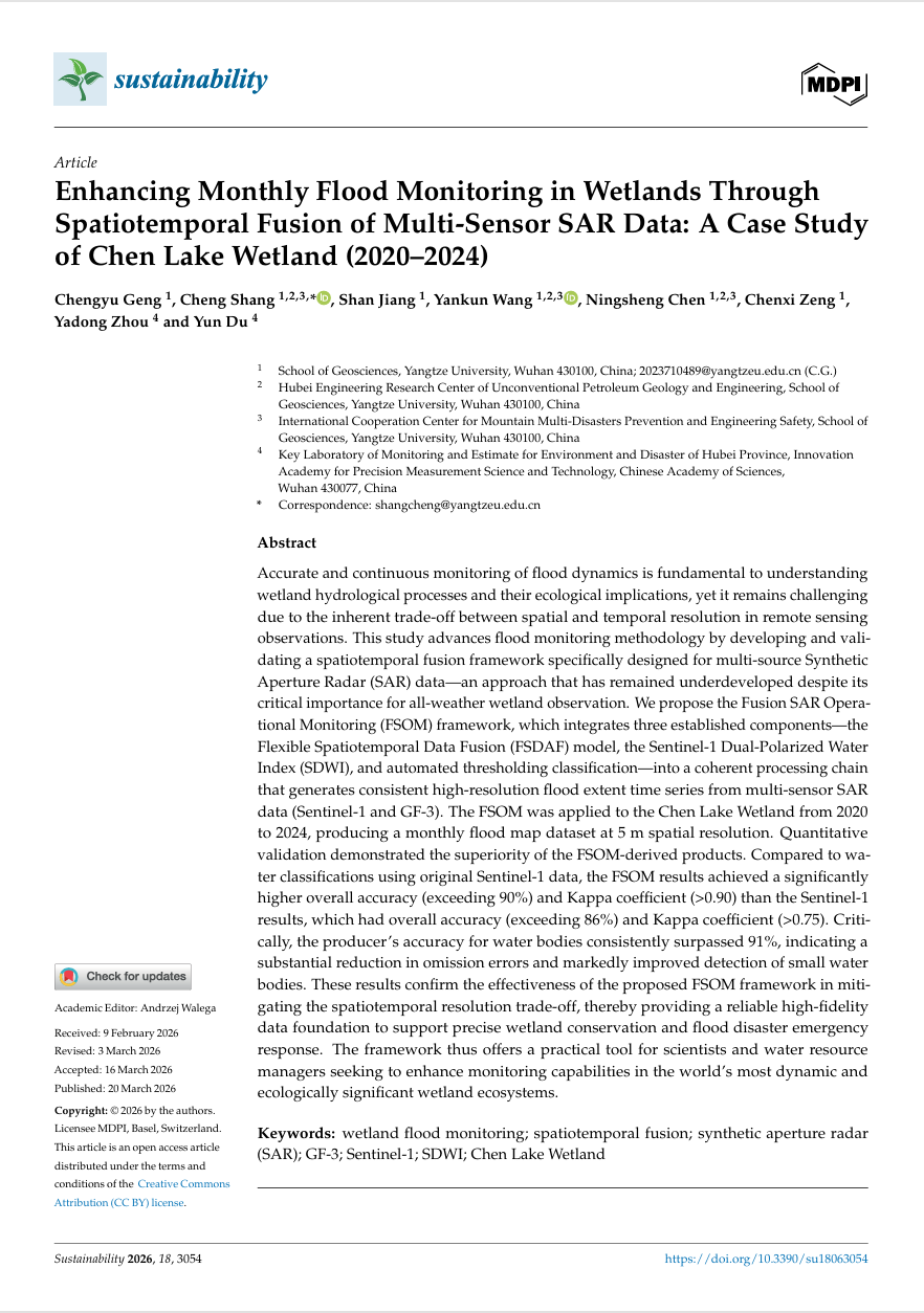 地球科学学院硕士研究生耿澄羽在资源与环境类SCI期刊《Sustainability》上发表题为“Enhancing Monthly Flood Monitoring in Wetlands Through Spatiotemporal Fusion of Multi-Sensor SAR Data: A Case Study of Chen Lake Wetland (2020–2024)”的研究论文。长江大学地球科学学院/山地多灾害防控与工程安全国际科技合作基地为论文第一署名单位,研究生耿澄羽为论文第一作者,尚成老师为通讯作者,论文是在尚成/陈宁生老师的指导下完成的。