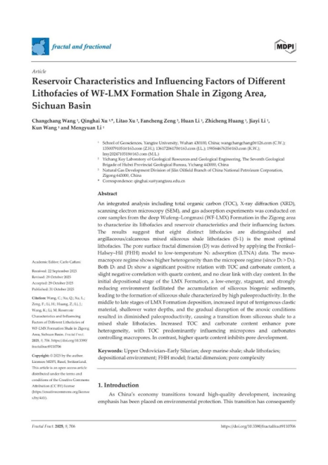 长江大学地球科学学院硕士生王畅畅在徐清海副教授的指导下,以第一作者身份在期刊《Fractal and Fractional》(IF 3.6)上发表题为《Reservoir characteristics and influencing factors of different lithofacies of WF-LMX formation shale》的研究论文。长江大学地球科学学院为论文第一署名单位,硕士研究生王畅畅为论文第一作者,徐清海副教授为通讯作者。