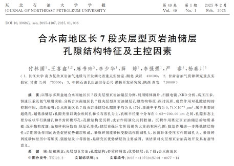 长江大学地球科学学院硕士研究生付林圃在《东北石油大学学报》发表了题为“合水南地区长7段夹层型页岩油储层孔隙结构特征及主控因素”的研究论文