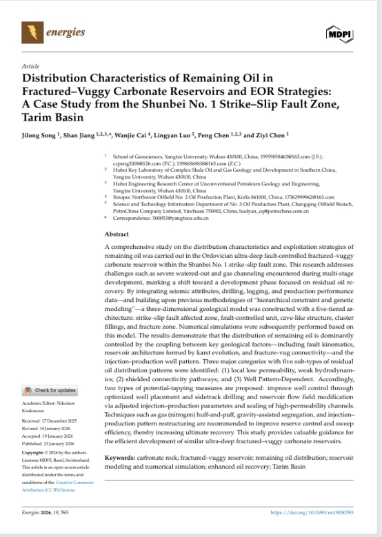 地球科学学院地质资源与地质工程专业硕士研究生宋吉龙在《energies》上发表题为“Distribution Characteristics of Remaining Oil in Fractured–Vuggy Carbonate Reservoirs and EOR Strategies: ACaseStudy from the Shunbei No. 1 Strike–Slip Fault Zone, Tarim Basin”的研究论文。长江大学为论文第一署名单位,硕士生宋吉龙为第一作者,江山教授为第一通讯作者。