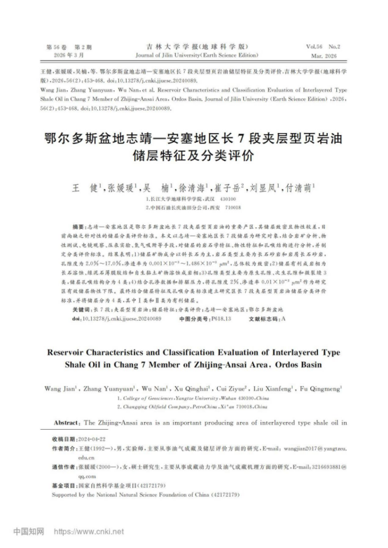 近日,长江大学地球科学学院实验师王健在中文核心期刊《吉林大学学报(地球科学版)》上发表了题为“鄂尔多斯盆地志靖—安塞地区长7段夹层型页岩油储层特征及分类评价”的论文。长江大学地球科学学院为论文第一署名单位,实验师王健为论文第一作者,硕士研究生张媛瑗为通讯作者。