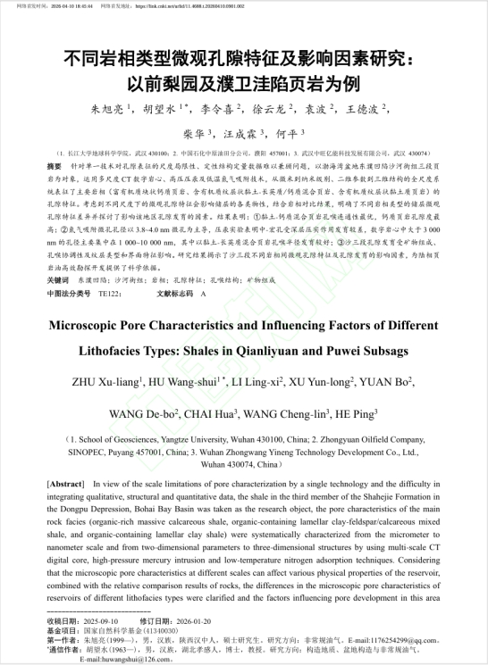 地球科学学院硕士生朱旭亮在《科学技术与工程》上发表题为“不同岩相类型微观孔隙特征及影响因素研究:以前梨园及濮卫洼陷页岩为例”的研究论文。长江大学地球科学学院为论文第一署名单位,硕士生朱旭亮为论文第一作者,教授胡望水为通讯作者。
