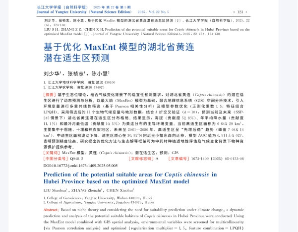 长江大学地球科学学院硕士研究生张祯志在《长江大学学报(自然科学版)》发表题为“基于优化MaxEnt模型的湖北省黄连潜在适生区预测”的研究论文。