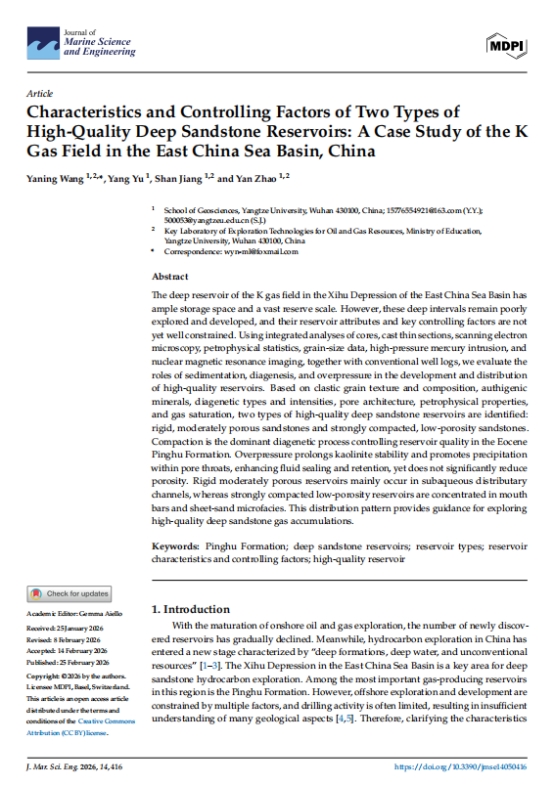 地球科学学院地质学专业硕士研究生于洋在SCI收录期刊《Journal of Marine Science and Engineering》上发表题为“Characteristics and Controlling Factors of Two Types of High-Quality Deep Sandstone Reservoirs: A Case Study of the K Gas Field in the East China Sea Basin, China”的研究论文。长江大学地球科学学院为论文第一署名单位,王雅宁副教授为第一作者。