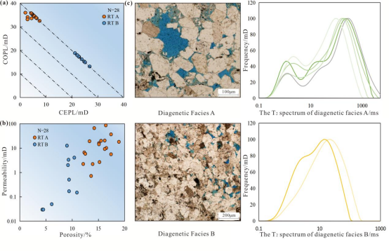该研究聚焦中国东海盆地西湖凹陷K气田深部储层,针对其勘探开发程度低、储层分类标准、成岩演化机制及优质储层控制因素不明确的问题,综合运用岩心观察、铸体薄片鉴定等多手段基础数据分析与常规测井资料,系统探究了沉积作用、成岩演化及异常超压对优质储层形成与分布的影响。研究将深层优质砂岩储层划分为刚性中孔砂岩、强压实低孔砂岩两类。明确压实作用是始新世平湖组储层物性演化的主导成岩作用。异常超压可通过抑制压实、促进次生孔隙发育等方式保存储层孔隙度;空间上,两类储层分别受控于三角洲前缘水下分流河道、河口砂坝与席状砂微相,均为平湖组主力产气层。该研究建立的储层分类标准与分布模式,为该气田勘探部署及中国东部近海盆地深层低渗-特低渗储层评价开发提供了精准依据与理论实践支撑。