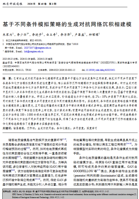 地科学院研究生朱家为以第一作者身份在中文核心期刊《地质科技通报》上发表题为“基于不同条件模拟策略的生成对抗网络沉积相建模”的研究论文,长江大学地球科学学院为论文第一署名单位。研究生朱家为为第一作者,李少华教授为论文通讯作者。