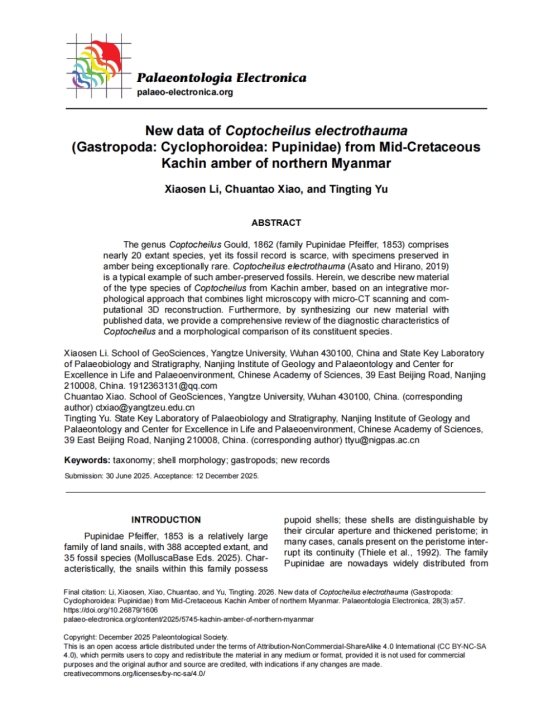 地球科学学院地质学专业硕士研究生李啸森在地球科学与古生物学领域期刊《Palaeontologia Electronica》上发表题为“New data ofCoptocheilus electrothauma(Gastropoda: Cyclophoroidea: Pupinidae) from Mid-Cretaceous Kachin Amber of northern Myanmar”的研究论文,李啸森为第一作者,我院肖传桃教授为第一通讯作者。