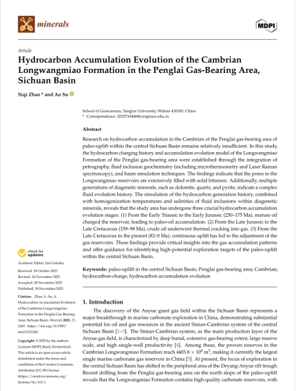 地球科学学院地质学专业硕士研究生赵思琪在《Minerals》上发表题为“Hydrocarbon Accumulation Evolution of the CambrianLongwangmiao Formation in the Penglai Gas-Bearing Area,Sichuan Basin”的研究论文。长江大学为论文第一署名单位,硕士生赵思琪为第一作者。