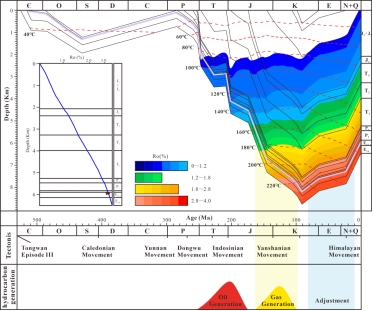 图2 川中古隆起北斜坡PS104井埋藏史和热演化史模拟结果