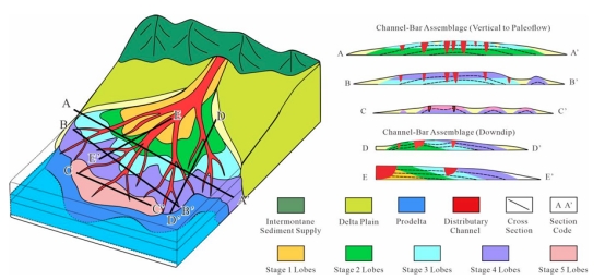 结果表明,研究区发育以反韵律为主的富砂型浅水三角洲前缘沉积,储层主体为河口坝砂体(占比30%),垂向叠置厚度达3~20m,平面上呈朵状展布。沉积物理模拟揭示富砂型厚层砂体形成机制与叠置样式,主干分流河道入湖后沉积物卸载形成增生体,主干分流河道分叉,下一单元新的主干河道形成并将沉积物带离进行新一期沉积,多期沉积形成大面积河道-河口坝组合的朵状复合体,内部表现为河道-河道拼接、河道-河口坝拼接、河口坝-河口坝拼接的构型样式。储层构型解剖表明,单一分流河道控制形成单一朵体,多条分流河道控制形成复合朵体,朵体间侧向拼接叠合,垂向表现为多期前积叠置。动态资料分析验证了储层构型划分的可靠性。