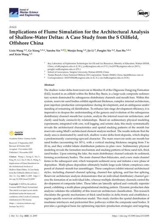 长江大学地球科学学院硕士研究生熊格在《Journal of Marine Science and Engineering》发表了题为“Implications of Flume Simulation forthe Architectural Analysis of Shallow-Water Deltas: A Case Study from the S Oilfield, Offshore China”的研究论文,长江大学地球科学学院为论文第一署名单位,硕士生熊格为通讯作者,导师王立鑫为第一作者。