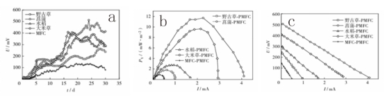 图2(a)四种PMFC和MFC输出电压曲线(b)输出电压曲线(c)极化曲线