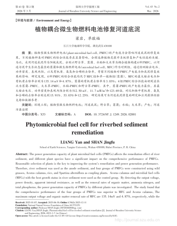 近日,地球科学学院硕士生梁岩在中文核心期刊《深圳大学学报》上发表题目为“植物耦合微生物燃料电池修复河道底泥”的研究论文。该论文以野古草、菖蒲、水稻和大米草为耦合植物构建4种PMFC,以河道污泥中生长状态最佳的菖蒲和微生物燃料电池(microbial fuel cell,MFC)作为对照组,通过检测输出电压、功率密度、表观内阻,以及有机质、氨氮和全磷的去除率,考察不同植物对PMFC产电能力和底泥修复效果的影响。长江大学地球科学学院为论文第一署名单位,硕士生梁岩为论文第一作者。