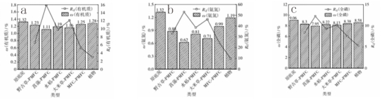 图3(a)有机质含量及有机质去除率对比(b)氨氮质量分数及氨氮去除率对比