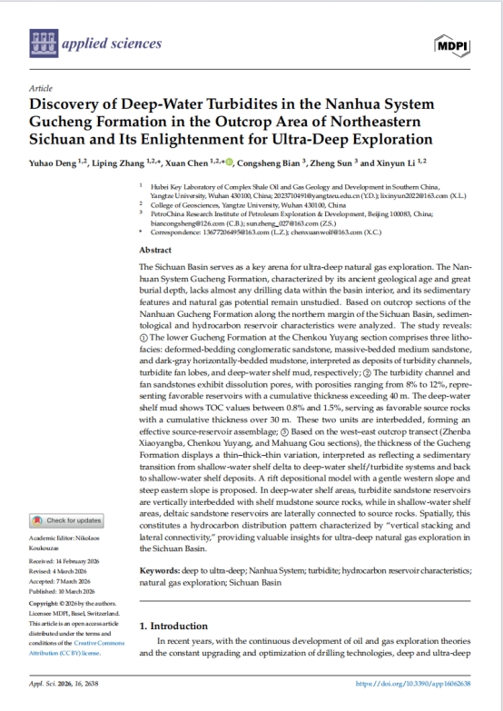 地球科学学院硕士生邓宇豪在SCI收录期刊《Applied Sciences》上发表题为“Discovery of Deep-Water Turbidites in the Nanhua System Gucheng Formation in the Outcrop Area of Northeastern Sichuan and Its Enlightenment for Ultra-Deep Exploration”的研究论文。长江大学地球科学学院为论文第一署名单位。
