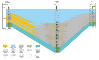 本次研究依托盆地北缘露头剖面开展沉积学与烃储特征分析,研究发现:在城口河鱼剖面古城组下部识别出变形层理含砾砂岩、块状层理中砂岩及深灰色水平层理泥岩三类岩相。其中砂岩溶蚀孔发育,孔隙度介于8%至12%之间,储集性能优越,累积厚度超40米;深水泥有机碳含量0.8%至1.5%,累积厚度超过30米。砂岩储层与泥质烃源岩互层叠置构成了优质的烃储组合。从镇巴小洋坝剖面经城口鱼洋剖面至蚂蝗沟剖面的东西向展布中,古城组厚度呈现薄-厚-薄的规律性变化。在这一沉积模式中深水陆棚区浊积砂岩与陆棚泥垂向叠置,浅水陆棚区三角洲砂岩与烃源岩侧向对接,共同构成了独特的烃储分布样式,为四川盆地超深层天然气勘探提供了重要的地质依据。