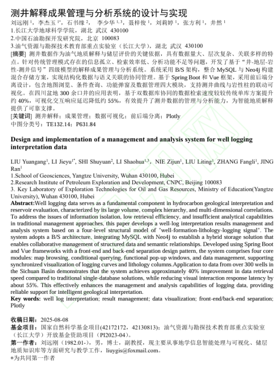 地球科学学院测绘工程2023级研究生李杰玉以共同第一作者身份在《长江大学学报(自然科学版)》上发表题为“测井解释成果管理与分析系统的设计与实现”的研究论文,长江大学地球科学学院为论文第一署名单位,导师刘远刚副教授为第一作者。